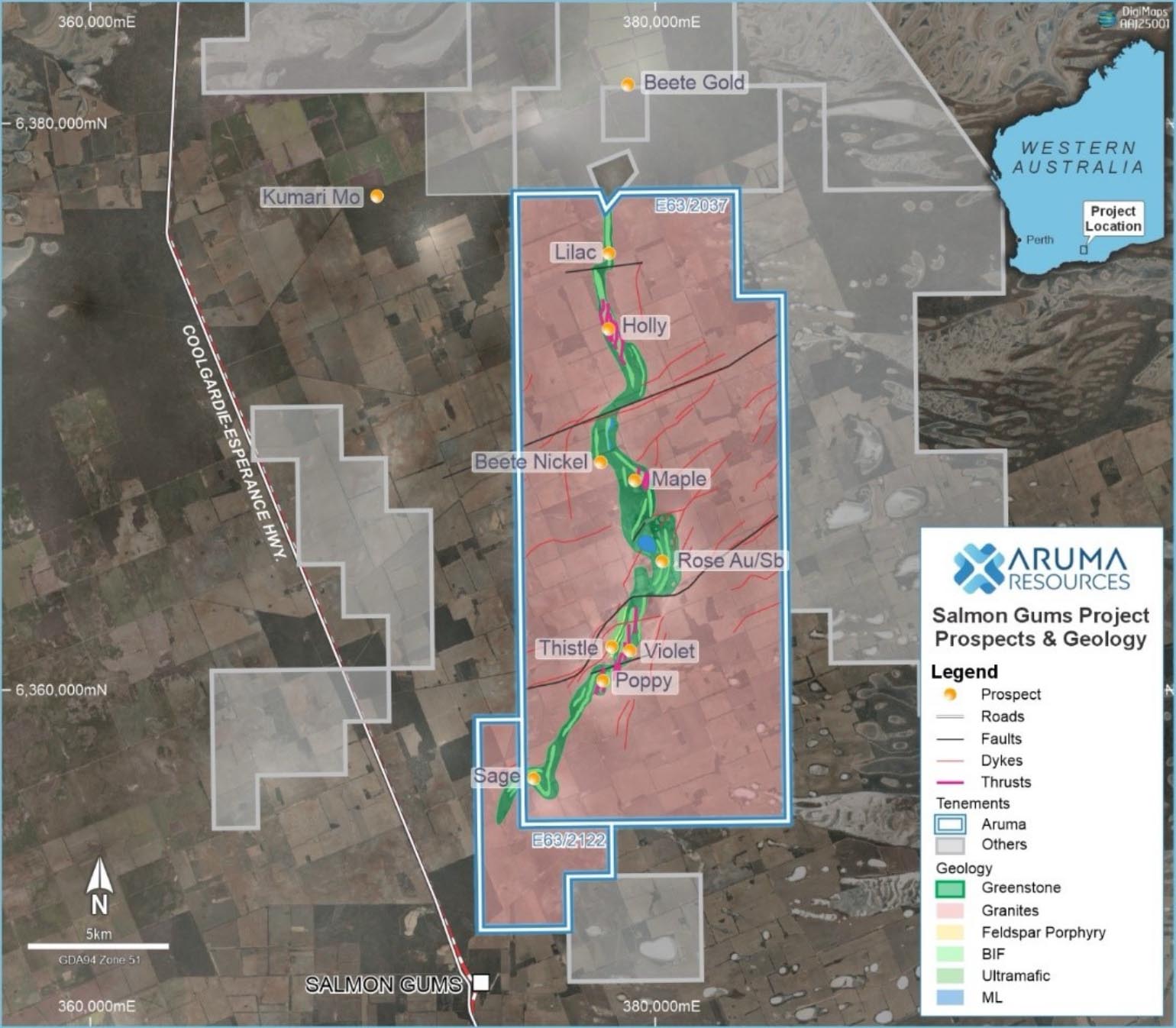 The Salmon Gums Project is interpreted to host Norseman-style, structurally controlled gold mineralisation within the Norsman Greenstone Belt, and has been the subject of multiple drilling program by Aruma;
